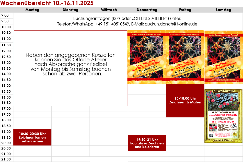 Sie können sich für keinen festen Termin entscheiden? Dann ist das „Offene Atelier“ sicherlich die geeignete Variante für Sie. Jenen Sonntagabend finden Sie die Termine für die darauffolgende Woche im „Wochenplan“